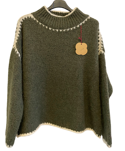 Soft Knitted Italian High Neck Jumper with Blanket Stitch Edging in Khaki