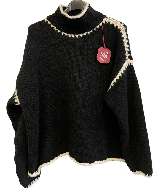 Soft Knitted Italian High Neck Jumper with Blanket Stitch Edging in Black
