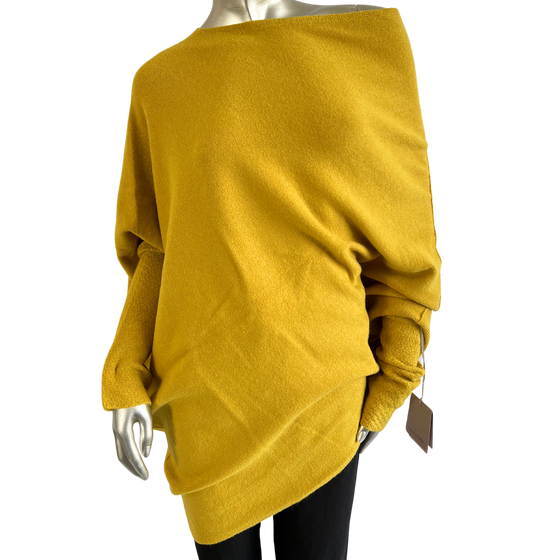 Asymmetric Draped Slouch Neck Soft Jumper with Long Fitted Sleeves in Mustard Yellow